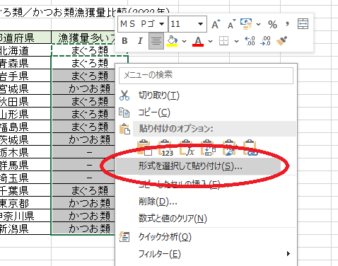 ③コピーしたいセルを選択してマウスを右クリック→「形式を選択して貼り付け」