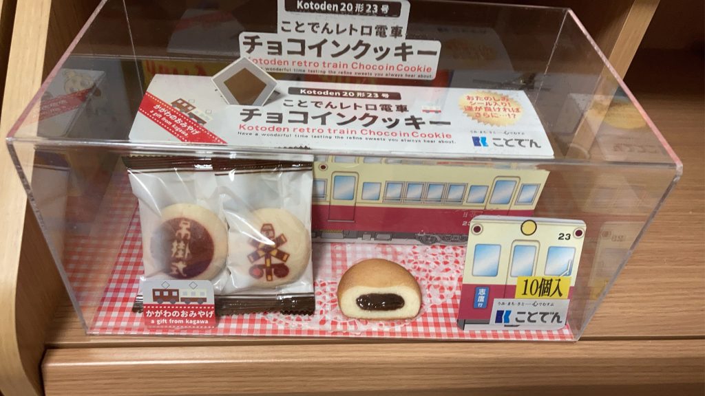 ことでん祭りでも1回500円で電車くじがあり、クッキーが当たった!と思ったら、サンプル。 食べられはしませんが、なかなか家で入手できないものなので飾って喜んでいるようです。
