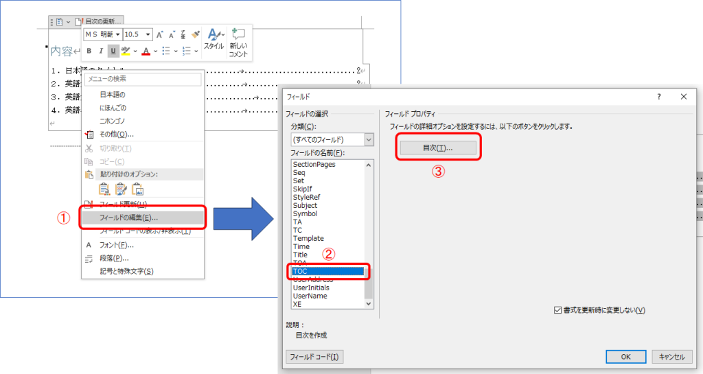 ①目次の文字部分で右クリックして「フィールドの編集」を選択