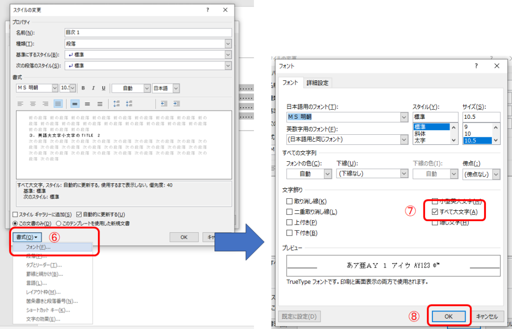 ⑦[フォント]ウィンドウで「すべて大文字」のチェックを外す